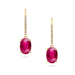 These classic drop earrings feature a pair of oval cut rubies set in four claws that hang from delicate white gold diamond set hooks.